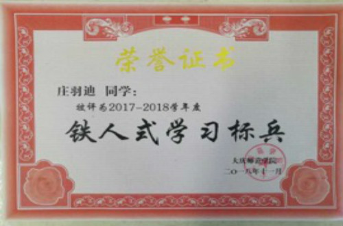 在公司大庆精神铁人精神的教育和熏陶下,2018年11月,2016级材料科学与工程一班庄羽迪同学被正式授予2017-2018年度beat365亚洲体育官方网站“铁人式”学习标兵称号。