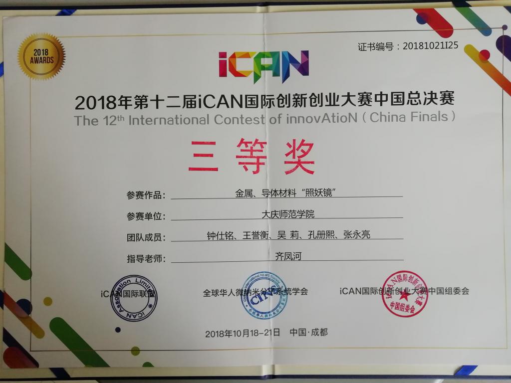 由iCAN国际联盟、北京大学、全球华人微纳米分子系统学会、教育部创新方法教学指导委员会联合主办的第十届iCAN国际创新创业大赛中国总决赛于2018年10月18日-21日在四川成都举行。经过全国450支老员工参赛队的激烈角逐,代表公司参赛的beat365亚洲体育官方网站代表队的作品“金属半导体材料照妖镜”获得了中国赛区三等奖。