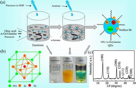 刘永皓教授团队通过一种配体辅助乳液技术,首次可控性地合成了具有明亮发光的和稳定性的纯MAPbBr3胶体量子点,并且量子点色度(绿色、蓝绿色、蓝色到紫色)连续可调,并且具有高达92%的绝对量子产率。这些优越的性能可以做为光电器件广泛研究,如发光二极管、电致发光器件、信息显示器、光电探测器、太阳能电池以及激光器等。