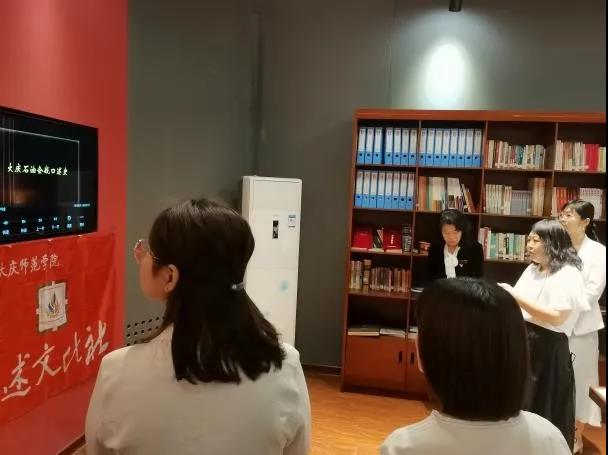 首先讲解员张文彬老师讲解了大庆精神文献研究中心的发展历程,然后带领参观人员进行历史文物展览模块的讲解。