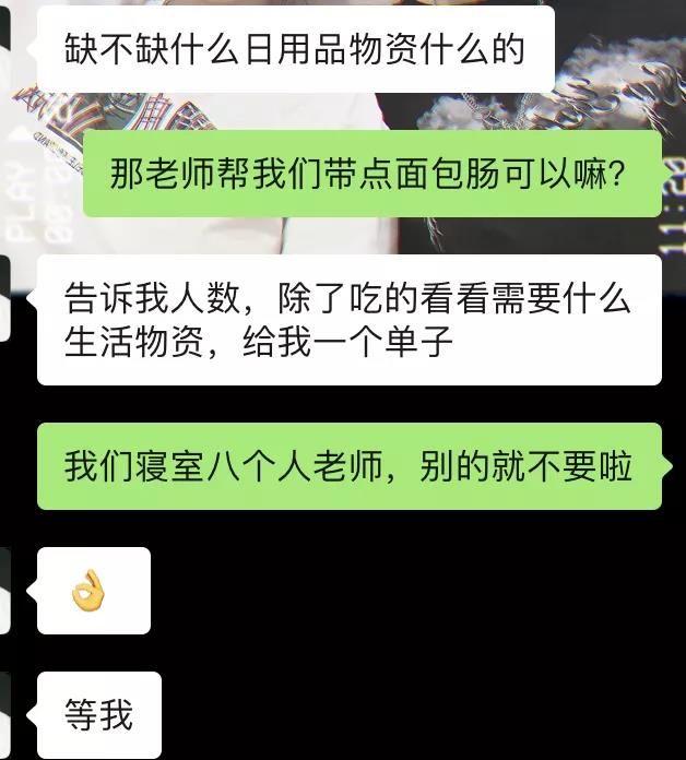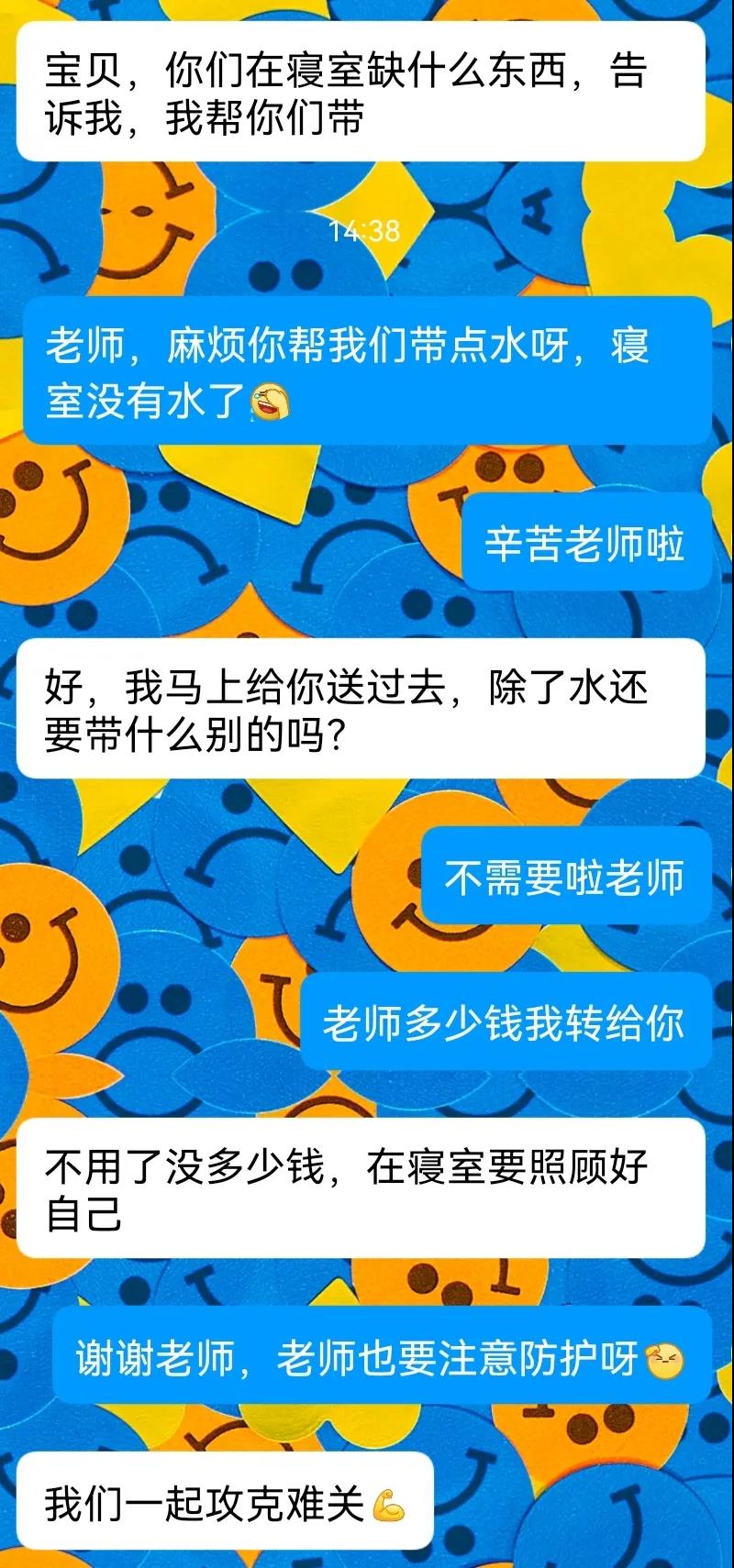 连日来,他们每天6点到取饭地点,微信运动三万余步。老师们来不及跟自己的孩子说声再见,只为公司的千名孩子能吃上一口热乎乎的早餐,他们不仅往返于宿舍食堂,还有药店和超市,同学们总说老师,行吗?老师的回答只有一句:可以,发给我吧,尽快送达。