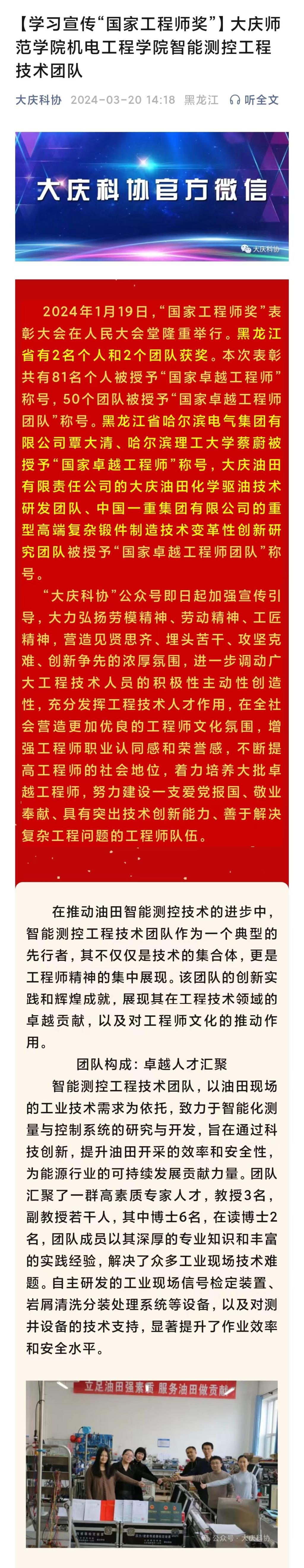 3月20日,“大庆科协”公众号以“学习宣传国家工程师奖-beat365亚洲体育官方网站智能测控工程技术团队”为题,报道了公司刘开绪教授牵头组建的“智能测控工程技术团队”在油田智能化测量与控制系统的研究与开发中取得的成绩,对技术团队在科学研究、技术开发、队伍建设和科研反哺教学等方面的工作给予了很高的评价(全文链接:https://mp.weixin.qq.com/s/jt_SpQxC8BvpB8StJEdW9Q)。