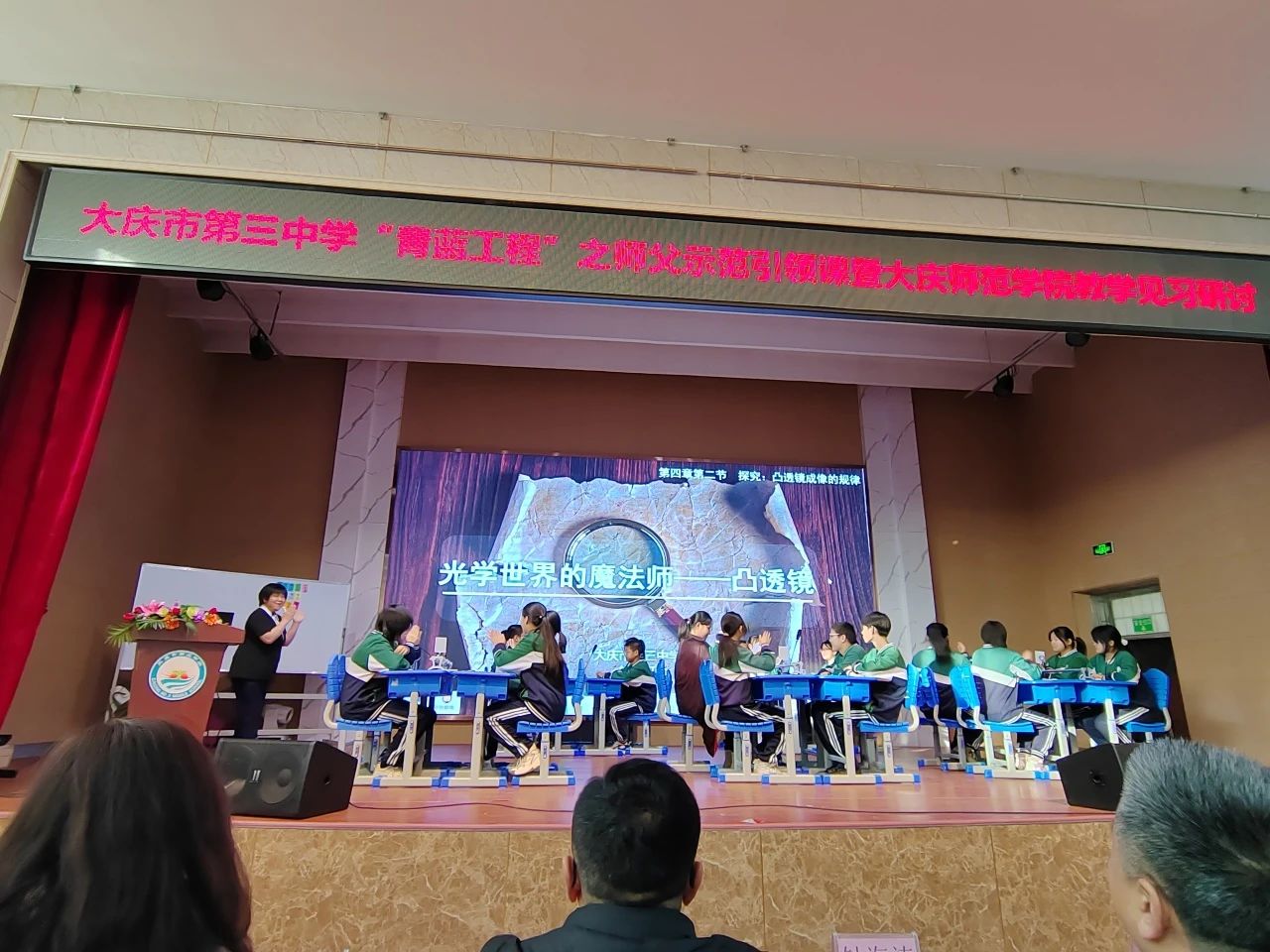 启动会后,王玉玲副经理带领22级物理学专业指导教师及22级物理学专业全体同学赴大庆市第三中学进行教育见习。本次活动大庆市第三中学高度重视、将教育见习与大庆市第三中学“青蓝工程”之师父引领示范课堂活动相结合、大庆市让胡路区教育局副局长钟海涛、让胡路区进修校董事长崔海彬、副董事长潘明浩、大庆市第三中学学董事长高峰、副董事长刘鋆星出席此次活动。