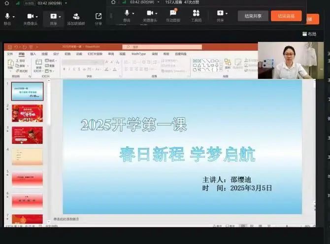 3月13日,公司党总支书记闻世宇为同学们讲授“开学第一课”。会上,她借助国产动画电影《哪吒之魔童闹海》开启互动,分享剖析其中的精彩片段,带领同学们深挖电影内核,鼓励同学们突破舒适区,扩大视野区,打造更好的自己。她对2025年全国两会精神进行了传达和解读,对于国家的发展形势和就业的现状进行了分析,鼓励同学们树立长远目标和短期目标,努力学习专业知识,不断提升自己的综合素质。对党员同学和员工干部提出要求,要扛起担当,做青年中的引领者和榜样,积极参与社会实践和志愿服务活动,廉洁做好组织交付的各项工作。希望全体同学在公司审核评估、专业认证、60周年校庆中贡献机电员工力量。最后,闻世宇以习近平总书记新年贺词的结束语勉励同学们:梦虽遥,追则能达;愿虽艰,持则可圆。愿同学们新学期一路披荆斩棘,追梦达愿,勇往直前!
