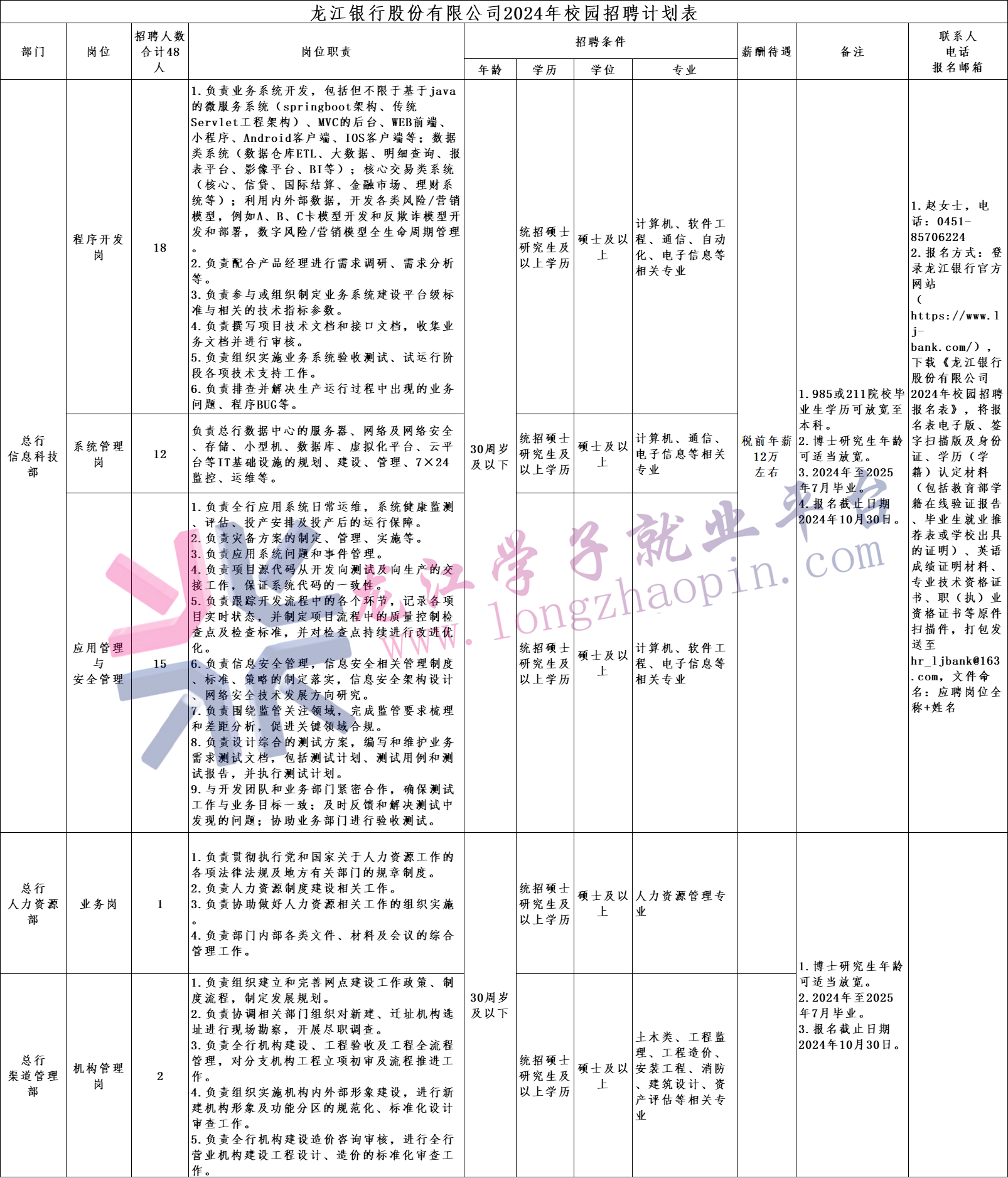 详见《龙江银行股份有限公司2024年校园招聘计划表》(附件1)。